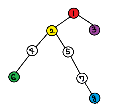 2번 노드(노랑)의 longest path는 [6, 4, 2, 5, 7, 8]이고 diameter는 5이다