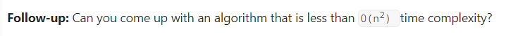 Follow-up에 O(n^2)보다 속도가 빠른 알고리즘으로 문제를 풀이하도록 유도하고 있다.